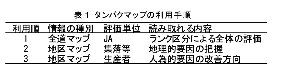 既存の品質データを活用し、図2の手順に準じて全道のJA別タンパクマップおよびモデル地区内の生産者別タンパクマップを簡易に作成することができる。タンパク変動の経年的変化に留意する必要はあるが、マップは地域レベルでの品質変動実態を概観する手段として利用できる(表1)。