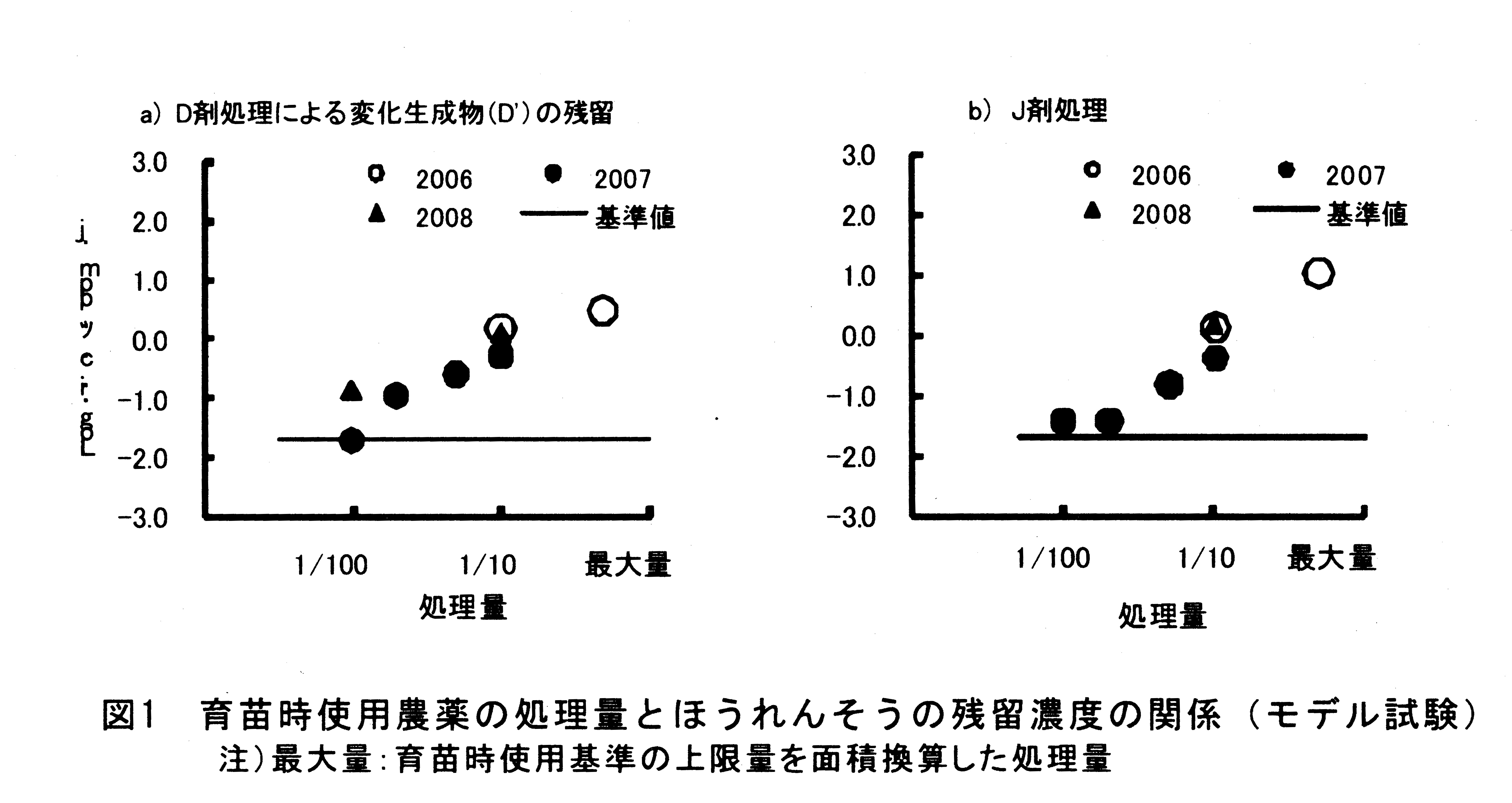 Dの変化生成物(D')およびJはほうれんそう可食部の残留基準値が極めて低く、最大量の1/100の処理量でもほうれんそう可食部の残留濃度は基準値を超過する(図1)。また、これらA、B、D、D'およびJは土壌分解が低濃度域で遅い傾向が認められる。