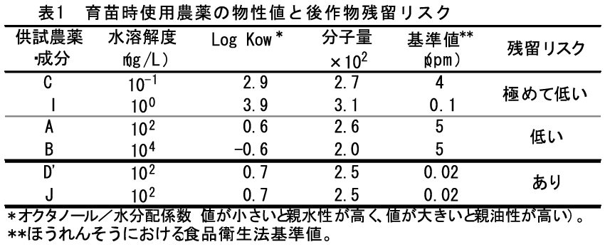 これらの成分は水溶解度が大きい、親水性が高い、分子量がやや小さい等の特徴があり、作物に吸収移行しやすい傾向がある。さらに後作物における残留基準値が極めて低い場合に育苗時使用農薬による後作物残留リスクが高まる(表1)。