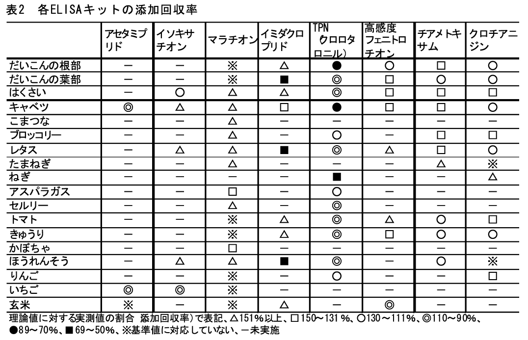 一方、たまねぎやねぎでは、回収率がかなり高くなる場合がある。また、特にマラチオン測定キットは測定下限の濃度が高く、野菜の残留基準値からみて適用できない野菜が多い(表2)。しかし、ほとんどのELISAキットの適用性は高く、スクリーニング検査、モニタリング調査に有効である。