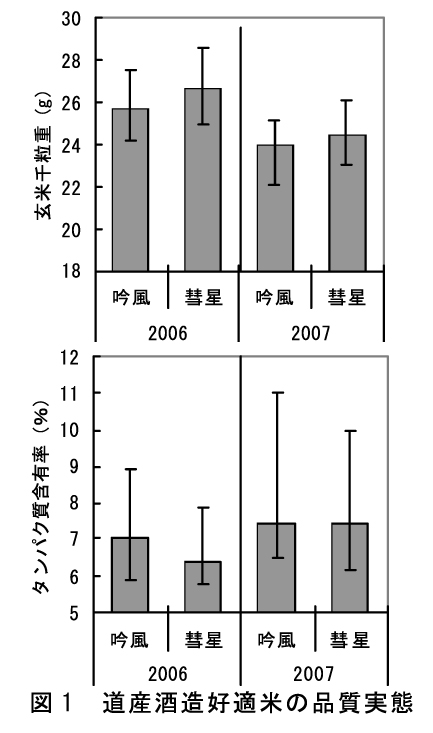 酒造好適米「吟風」、「彗星」の品質実態と栽培特性に基づく品質目標、生育指標を検討するとともに、それらに対応する栽培技術を明らかにし、道産酒造好適米の品質改善対策の確立を目指す。