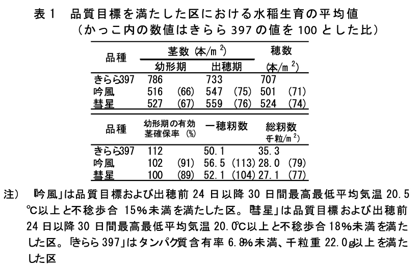 /m2「彗星」27千粒 /m2、精玄米重は「吟風」590kg/10a「彗星」610kg/10aとする(表1)。