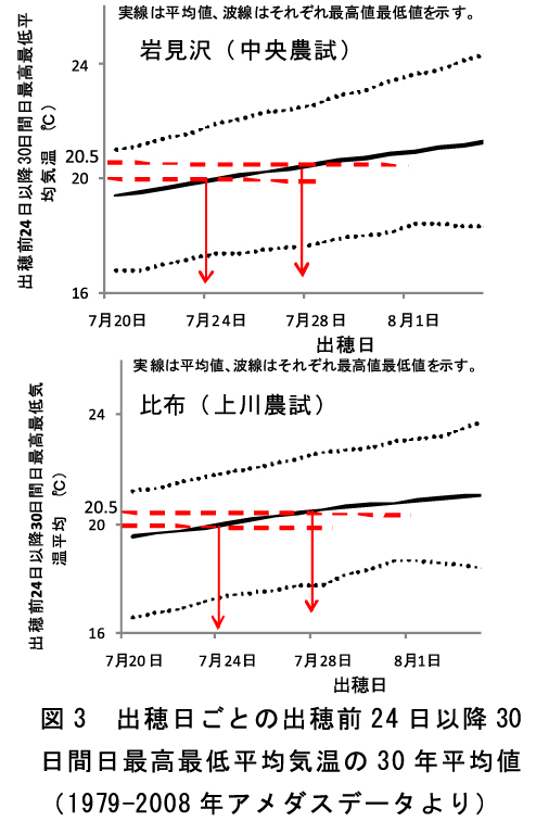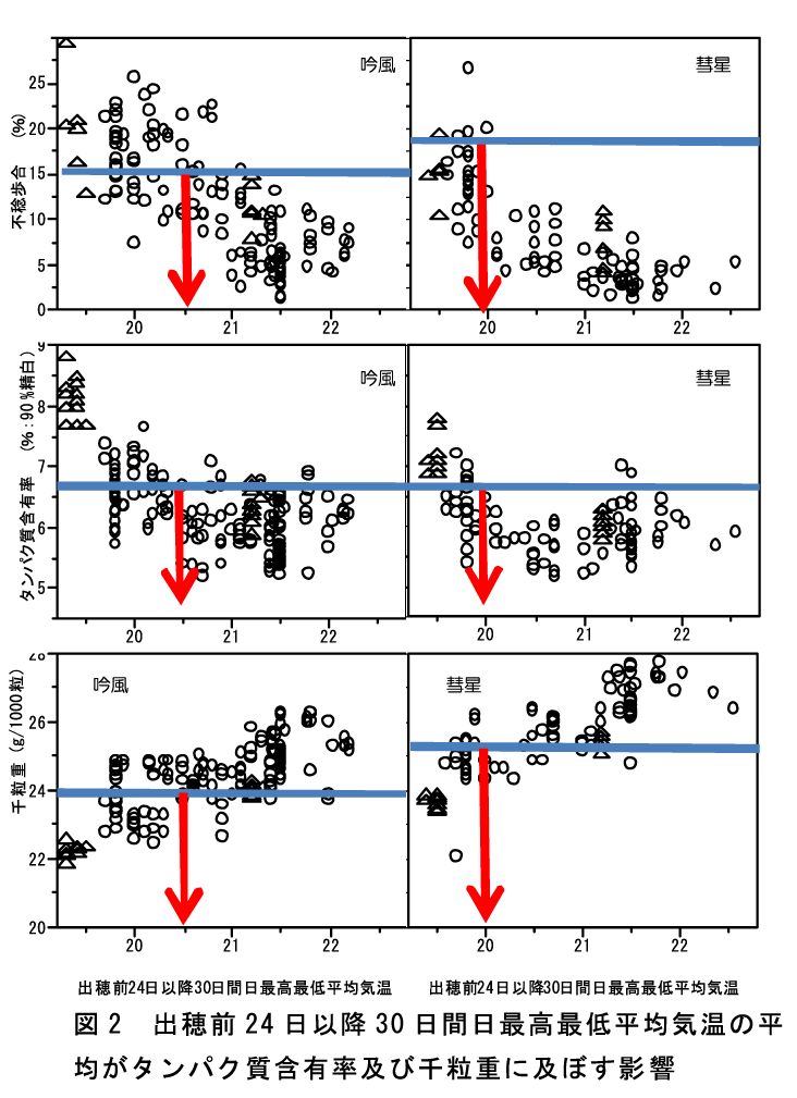- 出穂早限算出に利用される出穂前24日以降30日間日最高最低平均気温(日最高気温と日最低気温の平均から求めた平均気温)はタンパク質含有率および千粒重と相関があり、品質目標のため「吟風」20.5℃以上、「彗星」20.0℃以上が必要である(図2)。