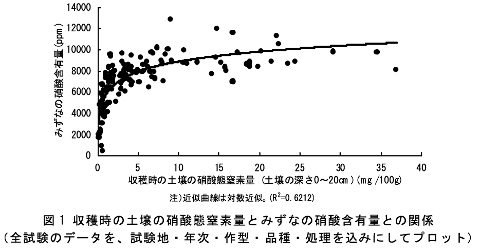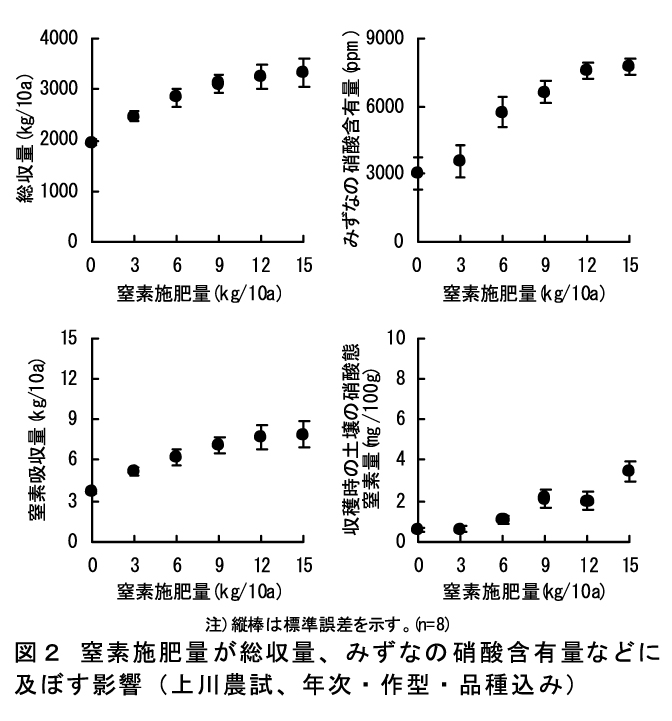窒素肥沃度が水準T(図3参照)である上川農試雨よけハウスでの窒素施用量試験の結果、総収量および窒素吸収量は窒素施肥量12kg/10aで概ね頭打ちとなり、収穫時の土壌硝酸態窒素量は15kg/10aで急激に増加することから、窒素肥沃度水準Tにおける適正な窒素施肥量は12kg/10aと考えられる。この時のみずなの硝酸含有量は約7600ppm(新鮮物あたり硝酸イオン濃度)である(図2)。