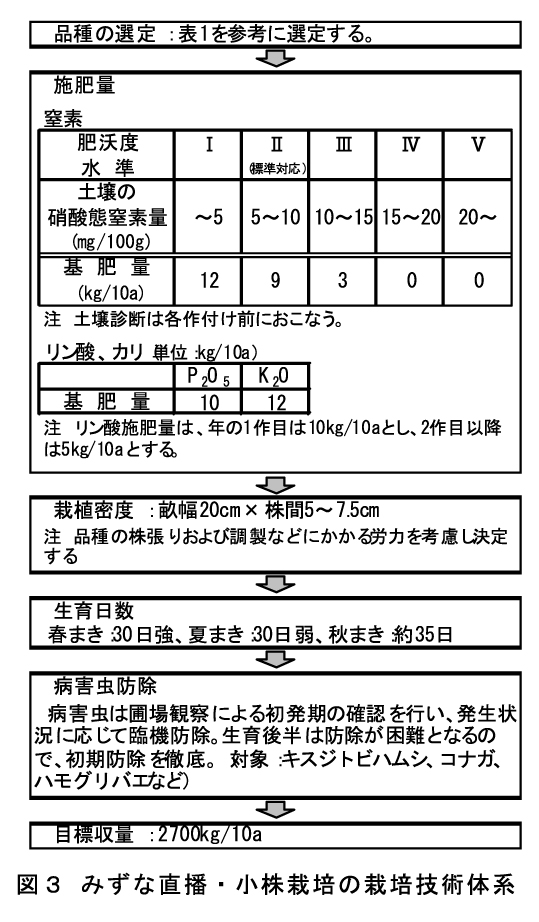 以上により、みずな直播・小株栽培の栽培技術体系を示す(図3)。
