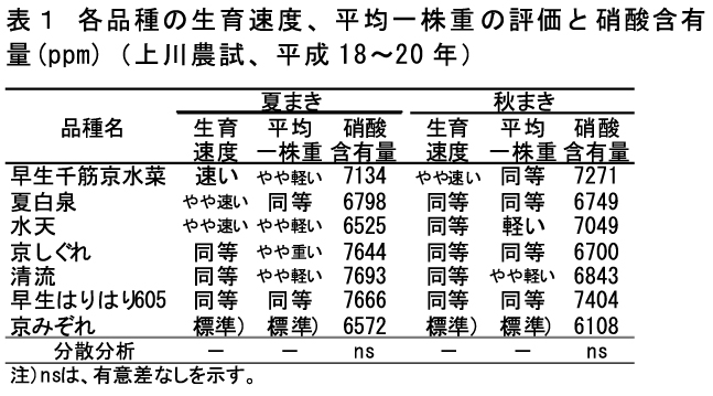 品種間で硝酸含有量に差はなく、生育速度、平均一株重、葉色と硝酸含有量との間にも関係は見られない(表1)。また、栽植密度がみずなの硝酸含有量に及ぼす影響に一定の傾向は認められない。このため、品種選定や栽植密度の変更によりみずなの硝酸含有量の低減を図ることは難しいと考えられる。