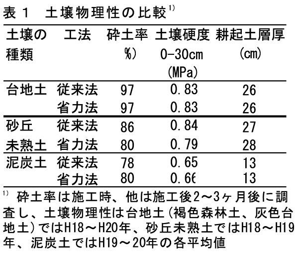 省力法の施工時の砕土率、施工後の土壌硬度および耕起土層厚は、台地土、砂丘未熟土、泥炭土のいずれにおいても従来法とほぼ同等である(表1)。