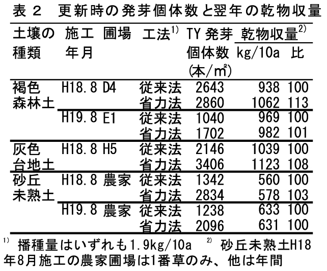 鉱質土における播種量1.9kg/10aの条件下では、省力法の更新当年の発芽個体数は従来法に勝り、翌年の年間乾物収量も従来法対比で100〜113%と増加する(表2)。