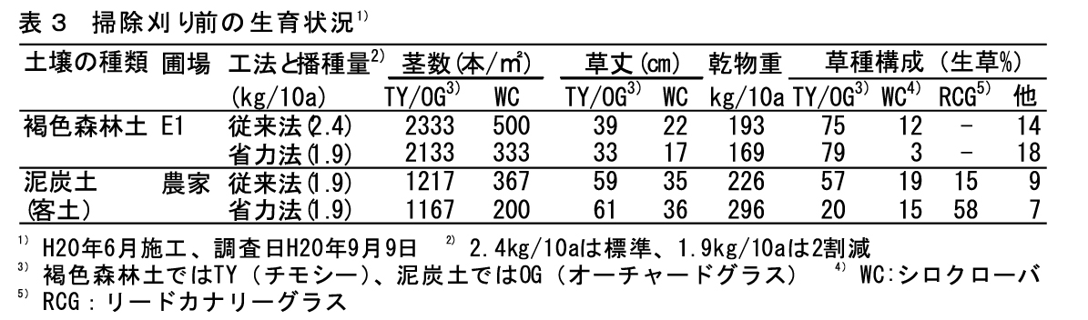 泥炭土における省力法(客土条件)の掃除刈り前の生育量は、従来法とほぼ同等である(表3)。