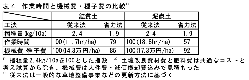 省力法の作業時間は従来法との比較で鉱質土では21%、泥炭土では43%短縮される(表4)。省力法の機械費と種子費のコストは従来法の播種量2.4kg/10aより、各土壌それぞれ、15%、8%低減される。
