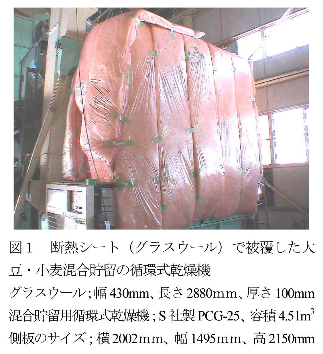 - 循環式乾燥機の外壁を断熱シート(グラスウール、厚さ100mm、幅430mm、長さ2880mm、熱伝達率0.5[W/m2K])で図1のように乾燥機側板を密着して被覆することによって、外気温が低い場合に乾燥機側板からの放熱を防ぐことができる。