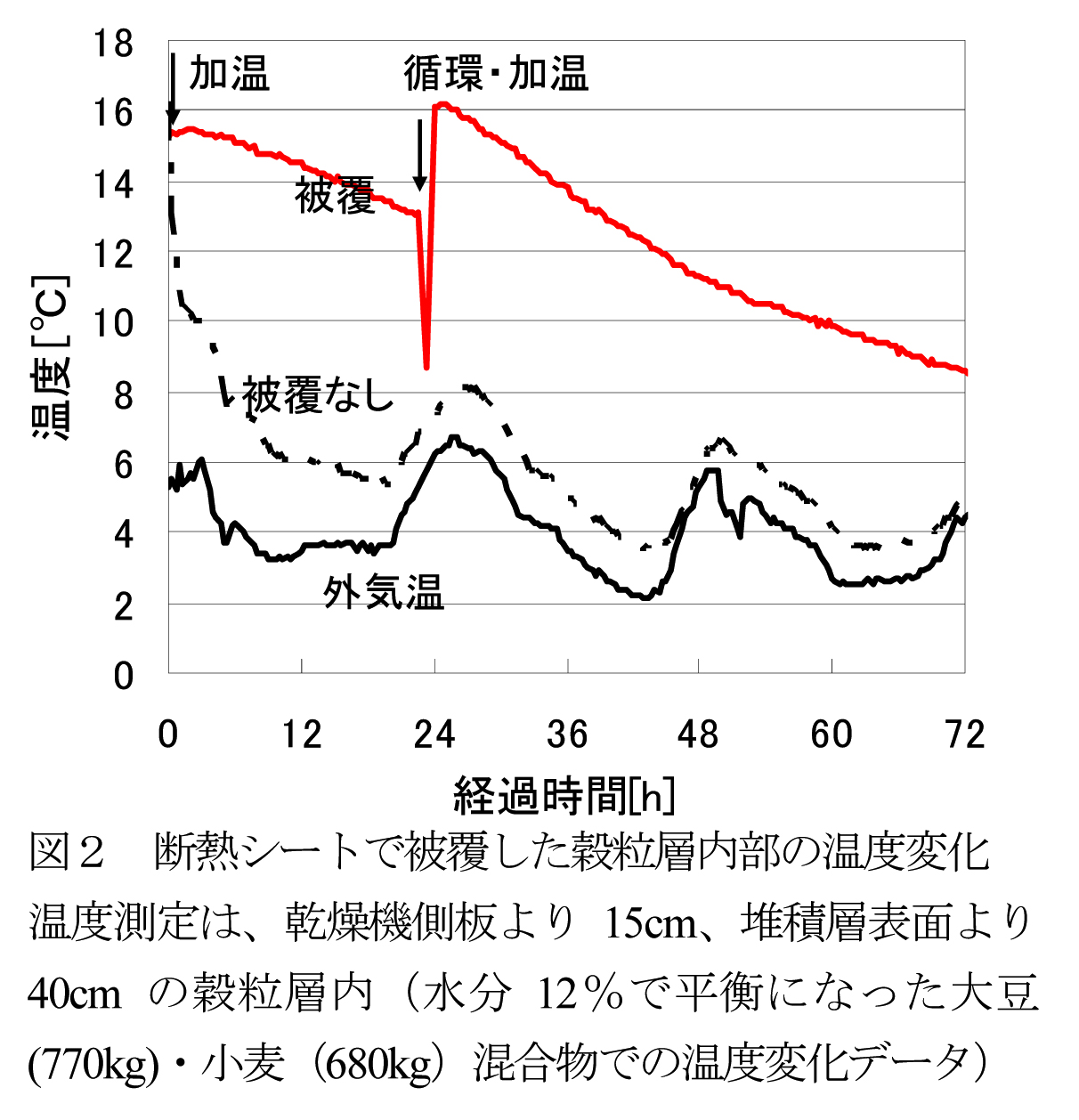- 断熱シートで被覆した乾燥機内の側板から15cm内側の大豆・小麦混合物堆積層内の温度、および断熱被覆のない対照区(被覆なし)の温度は、図2のように、対照区は、加温後の温度低下が早く、24時間以内に外気温+2℃以下に低下するのに比べ、被覆した堆積層では、48時間まで外気温+5℃以上で推移し、長時間の保温効果がある。そのため、乾燥直後の25〜30℃くらいに温まった小麦を大豆と混合することによって、途中の加温を必要とせずに迅速に乾燥することができる。
