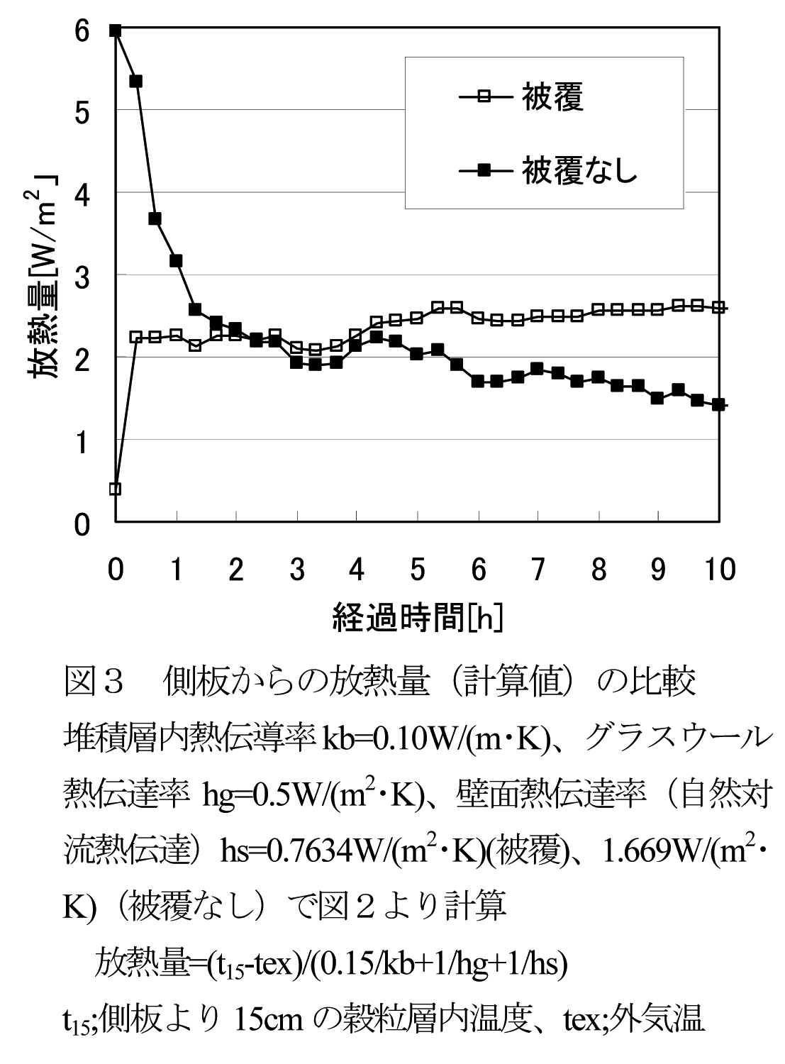 - 堆積層内温度と外気温と堆積層、断熱シート、外表面層での熱伝達率から計算される単位面積当たり放熱量は、図3のように、被覆なしでは2時間後までの放熱量が多く、温度低下が早いが、被覆した場合は、放熱量が少なく推移し、堆積層内の温度が保たれる。