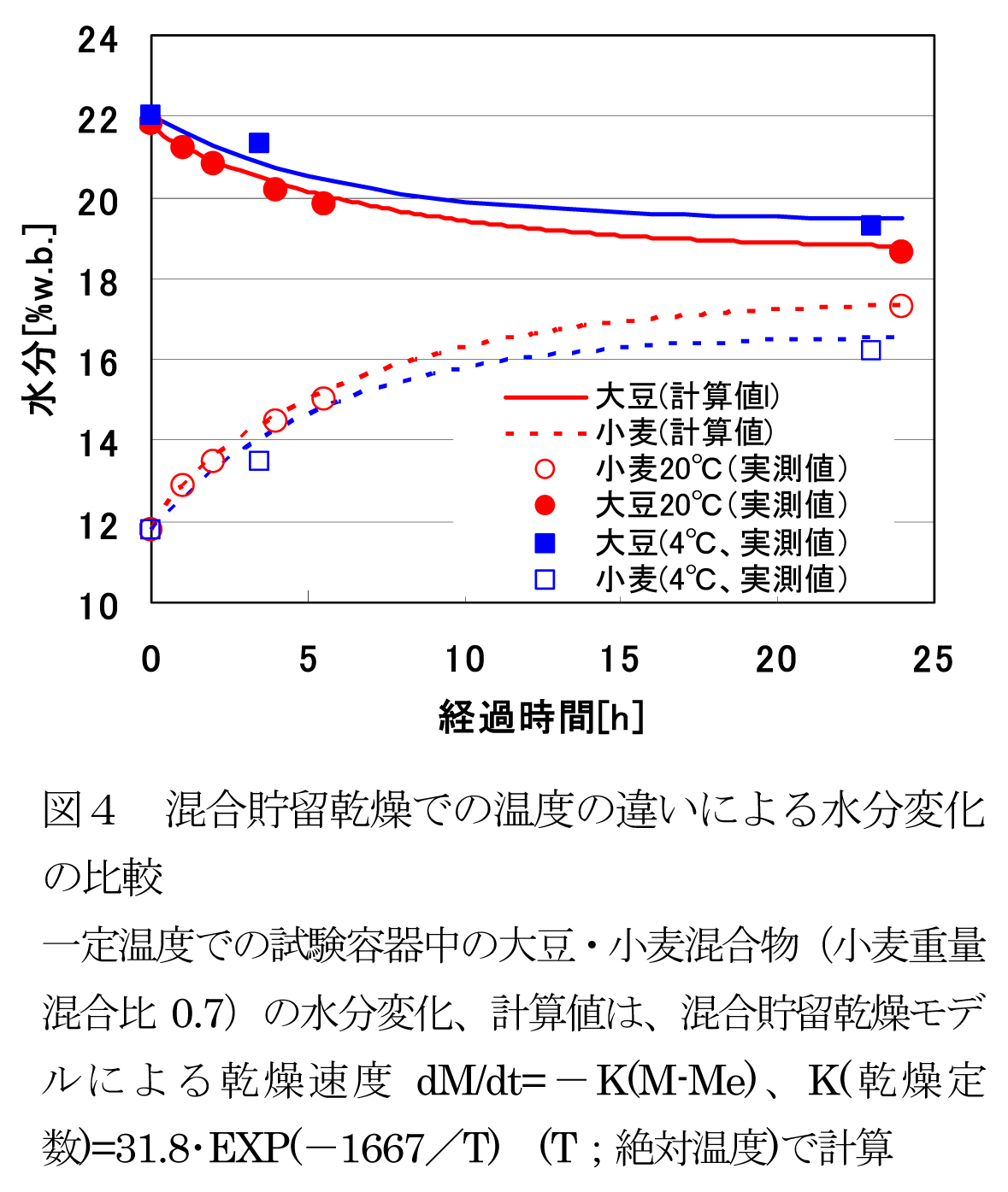- 一定温度条件下の試験容器の混合貯留中の混合物の水分変化は、図4のようであり、混合物は減率1段の実験式で表される水分変化を示し、温度が高い方が平衡水分差(ヒステリシス)も小さく、大豆から小麦への水分移行速度も速まる。