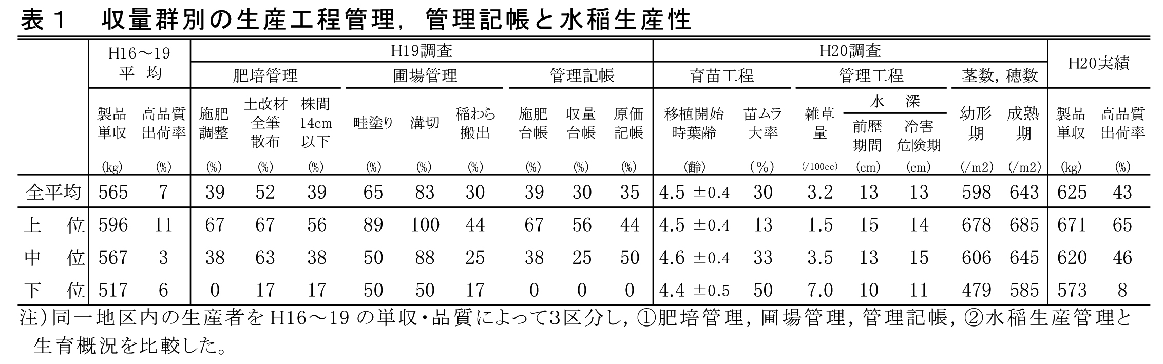 - 同一地区内であっても,水稲単収,品質には固定的な経営間格差が認められる。(表1)