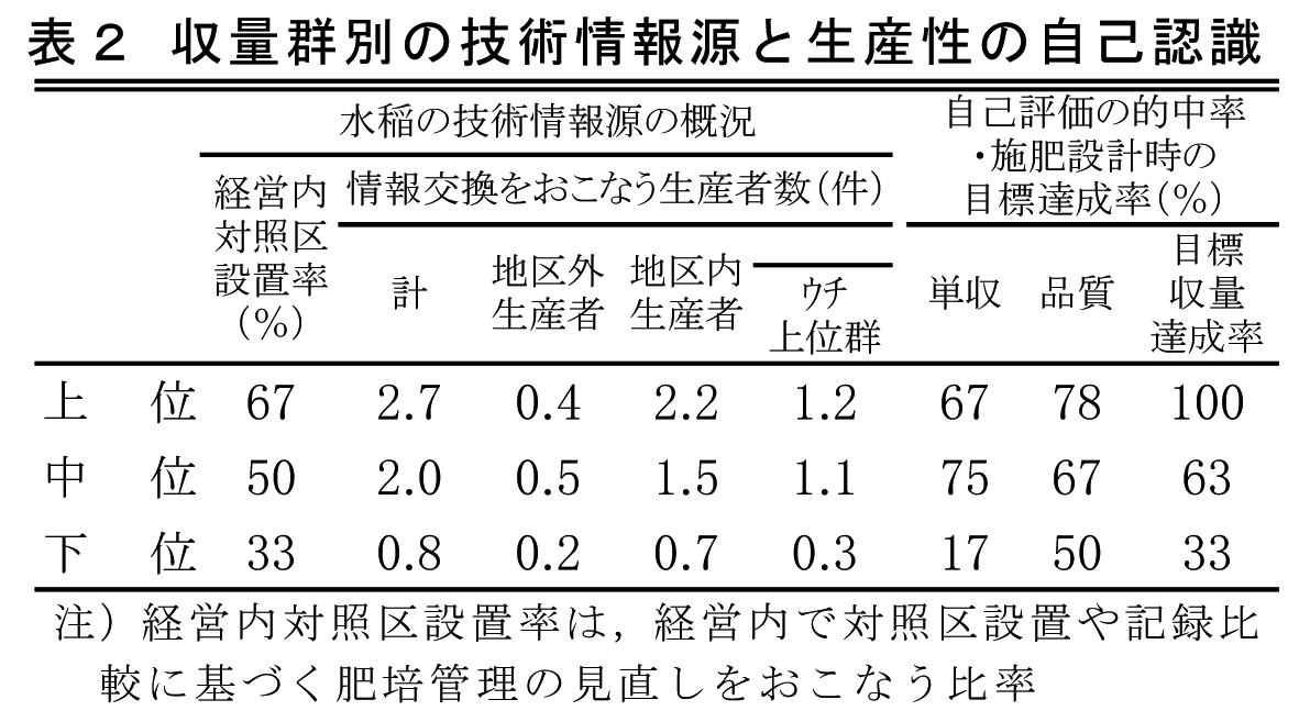 - 収量群ごとに水稲生産技術の情報源や情報ネットワーク(生産者間の情報交換)には差がある。情報交換の程度と自己評価や目標設定の適正さには正の相関があり,とりわけ下位群では情報交換の少なさが自己の正確な位置を認識することを阻害している。認識改善を通じて改善行動を促すには,@グループ活動による情報交換の強化,A経営内での検証活動が有効である。(表2)