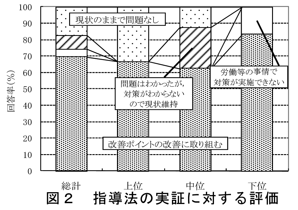 - 以上に基づいて確立した指導手順は,@生産性における問題状況の再確認,A群区分と特徴把握,B生産工程,圃場別成績の精査,C経済評価,Dグループ活動推進,Eグループ活動の高度化の6段階からなる。(図1)。指導法を実証したところ,生産者の管理行動への意識の改善が認められ,とりわけ下位群において効果は大きい。(図2)