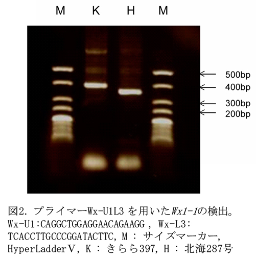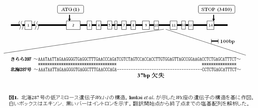 - 良食味水稲品種「おぼろづき」の親系統「北海287号」の低アミロース性は、第10イントロンに37塩基の欠失を持つ第6染色体上の新規遺伝子Wx1-1に支配される(図1)。Wx1-1は、欠失を指標に設計したDNAマーカーWx-U1L3によって選抜できる(図2)。プライマーの塩基配列は、Wx-U1:CAGGCTGGAGGAACAGAAGG、およびWx-L3:TCACCTTGCCCGGATACTTCである。