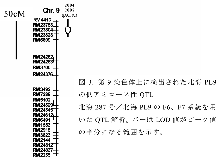 - 耐冷性中間母本系統「北海PL9」の低アミロース性は、第9染色体短腕上の遺伝子座qAC9.3に支配される(図3)。本遺伝子座の北海PL9型対立遺伝子は、近傍のDNAマーカーRM23804を用いて選抜できる。