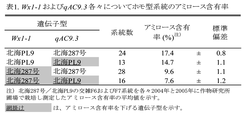 - 「北海287号」/「北海PL9」の交配後代においては、Wx1-1はアミロース含有率を7〜8ポイント低下させる。qAC9.3座の北海PL9型対立遺伝子はアミロース含有率を2〜3ポイント低下させる。2つの遺伝子は相加的に働く(表1)。