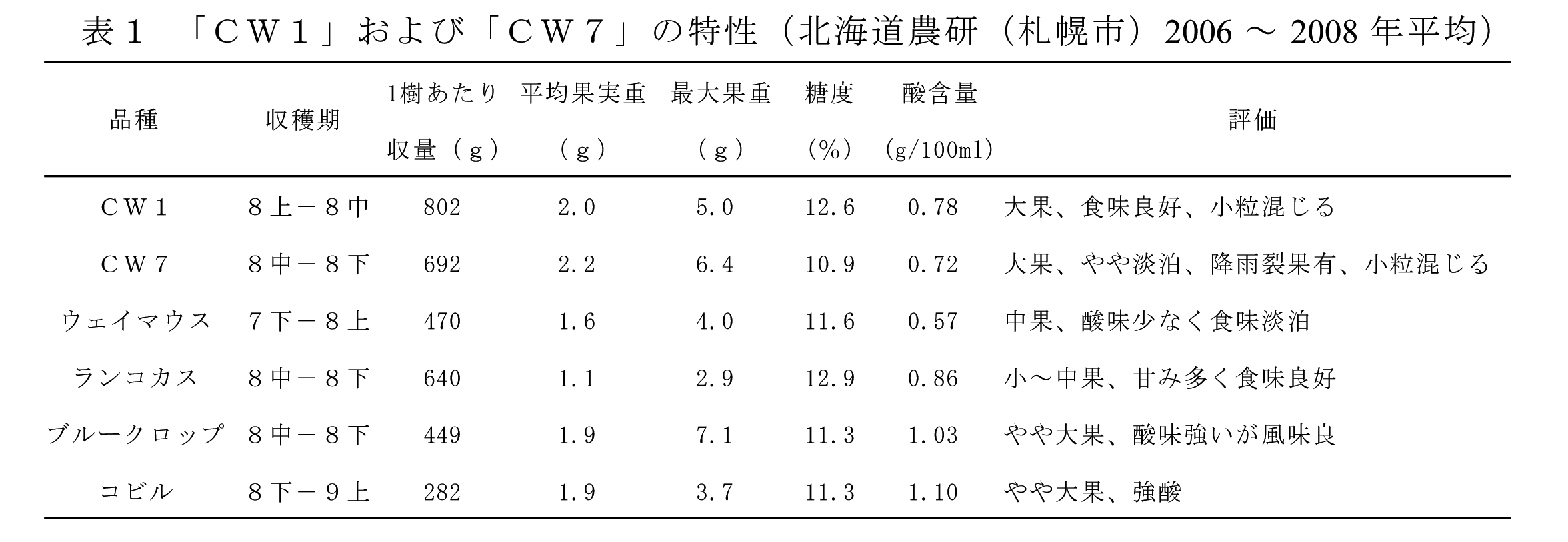 - 「CW1」および「CW7」は、いずれも1975年に北海道農業試験場(現:北海道農業研究センター)において、「コビル」に「ウェイマウス」を交雑して、得られた実生から選抜した系統である。2005年から育成地(札幌市豊平区羊ヶ丘)の圃場で挿し木繁殖個体を用いた生産力検定試験を実施して検討した結果、北海道向きのハイブッシュブルーベリー品種候補として優れた特性を示した。