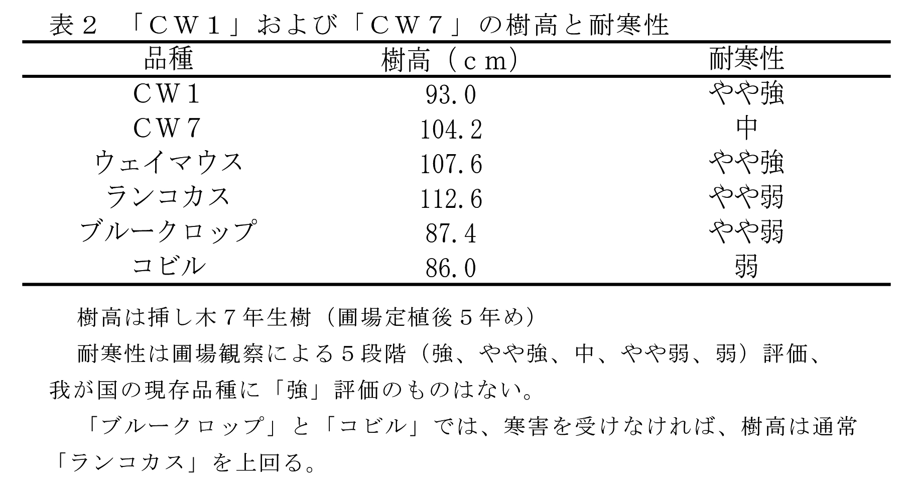 - 「CW7」は育成地で8月中下旬に成熟する。樹勢は「中」で、やや低い品種「ウェイマウス」と同程度である。果実外観は果粉が多く非常に良好である。果実重は2.2g程度である。糖度は11%程度で、酸含量は0.7g/100ml程度である。降雨による裂果の発生が若干みられる。1樹あたり収量は多い。北海道での圃場耐寒性は「中」で「ブルークロップ」、「ランコカス」より強い(表1、表2、図2)。