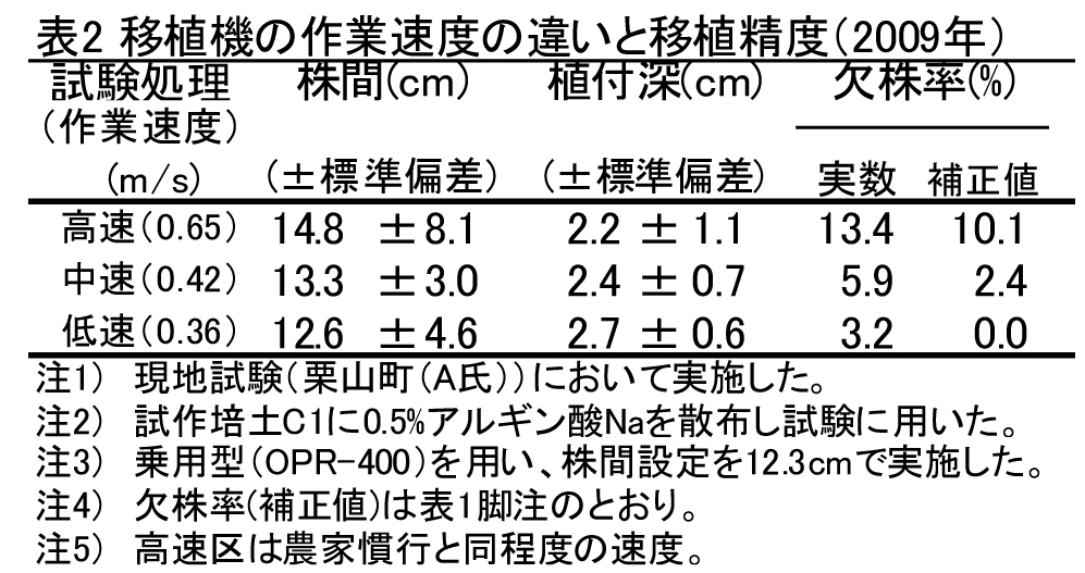 - 本組合せにおける機械移植時の作業速度は高速区(0.65m/s、慣行)では欠株率(補正値)が10.1%と高いが、中速区(0.42m/s)では2.4%と低く、移植精度が高まる(表2)。