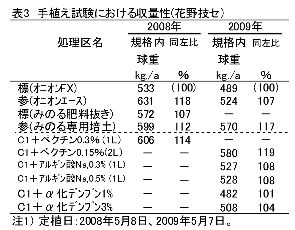 - 試作培土C1と固化剤が収量に及ぼす影響を手植え試験において検討したが、収量 への影響は認められない(表3)。