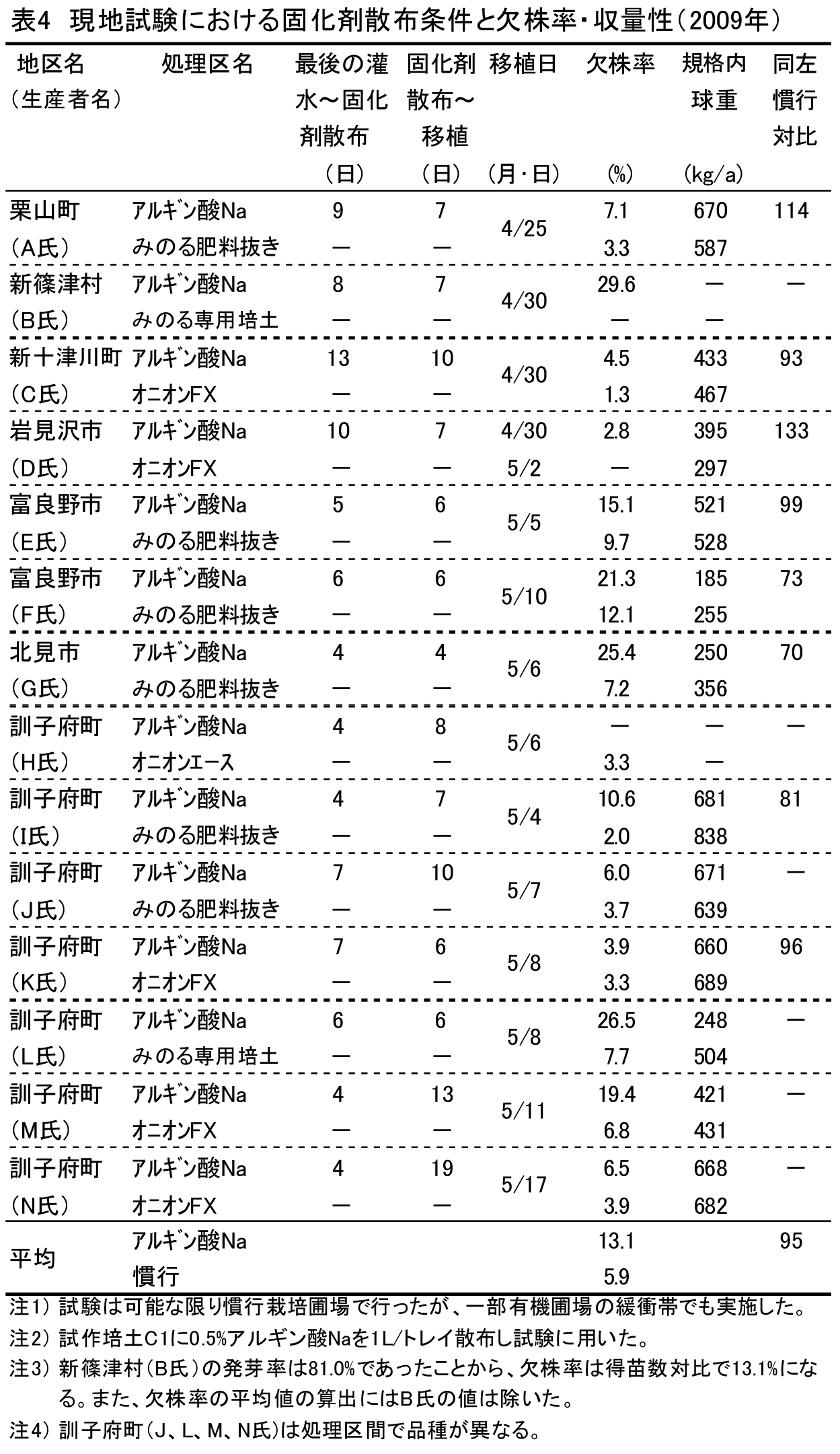 - 0.5%アルギン酸Na溶液を散布処理し最適な固化条件を得るには、移植予定の2週間前から培土の乾燥を開始し8日程度の灌水中断期間を設け、ポットと培土の間に間隙を生じさせる必要があり、これにより固化剤が根鉢側面によく浸透する状態になる。また、散布した固化剤の固化にも6日程度の乾燥処理が必要である。固化剤が根鉢下部までよく浸透した場合に欠株率が低く、慣行と同程度の収量水準となる(表4)。