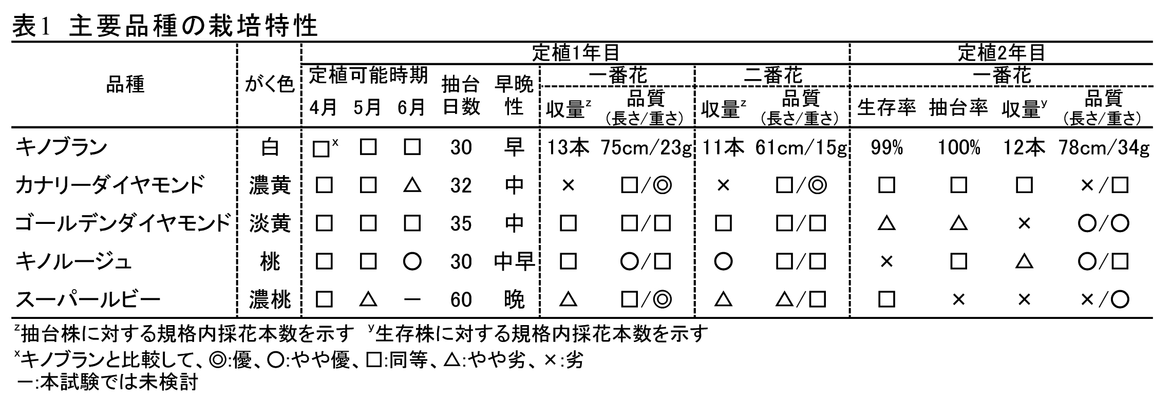- 主要品種の定植可能時期や越冬性等の特性を表1に示す。「キノブラン」と比較して「カナリーダイヤモンド」は、高温期に定植すると抽台率がやや低下し、収量は劣るが、一番花、二番花ともに切り花品質は優れる。「キノルージュ」は、高温期に定植しても抽台率が高く、二番花の収量が多い。越冬性および定植2年目の収量は「キノブラン」が最も優れる。