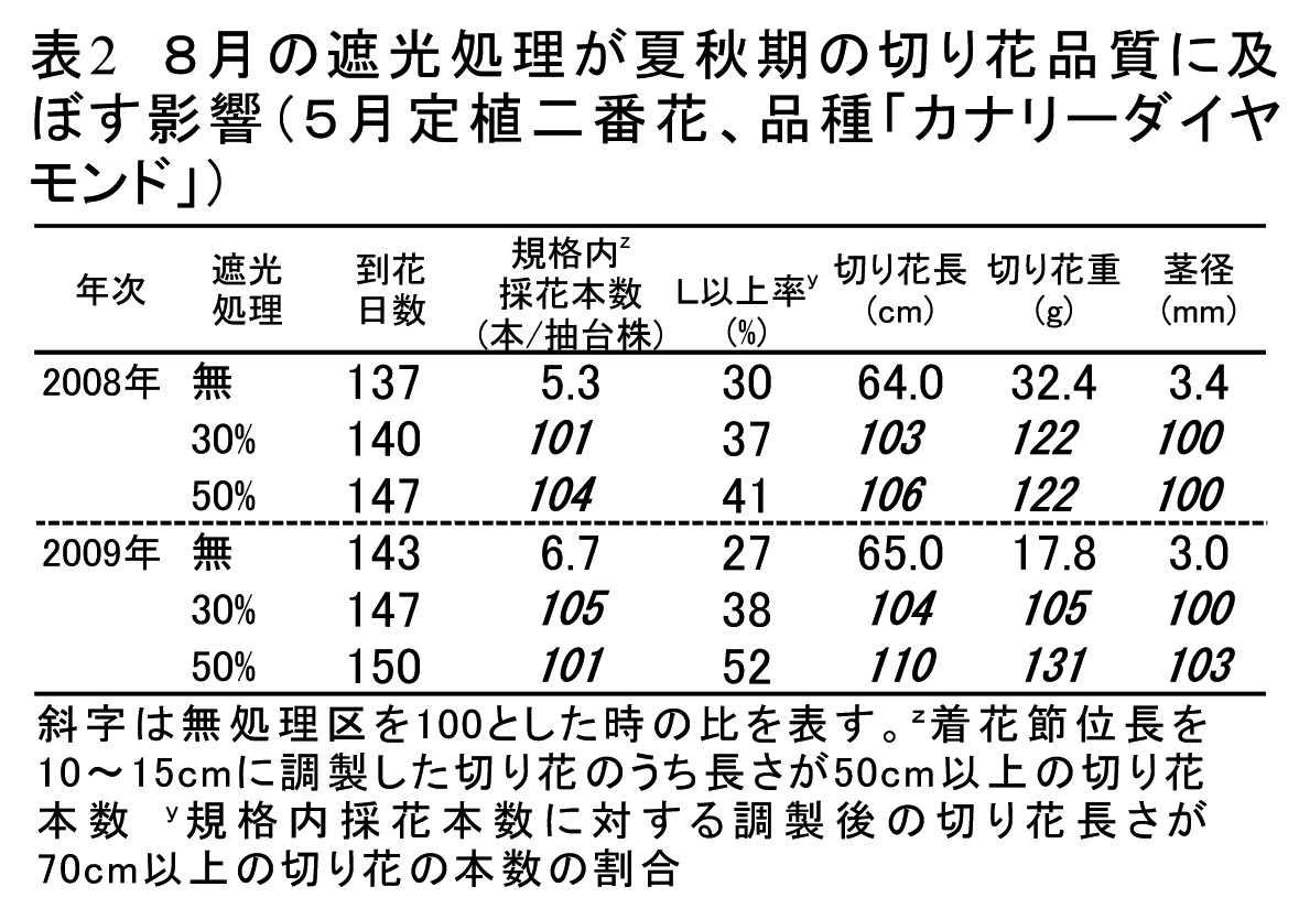 - 5月定植で、一番花採花期前後である8月に遮光処理を行うことで、9月〜10月上旬に採花される二番花では、規格内採花本数が増加し、切り花品質も向上する。また、日照不足であった年でも効果が認められる(表2)。「カナリーダイヤモンド」での経済性試算の結果、粗収入額−直接経費は無処理区より遮光区で多く、遮光処理により収益性は向上する。
