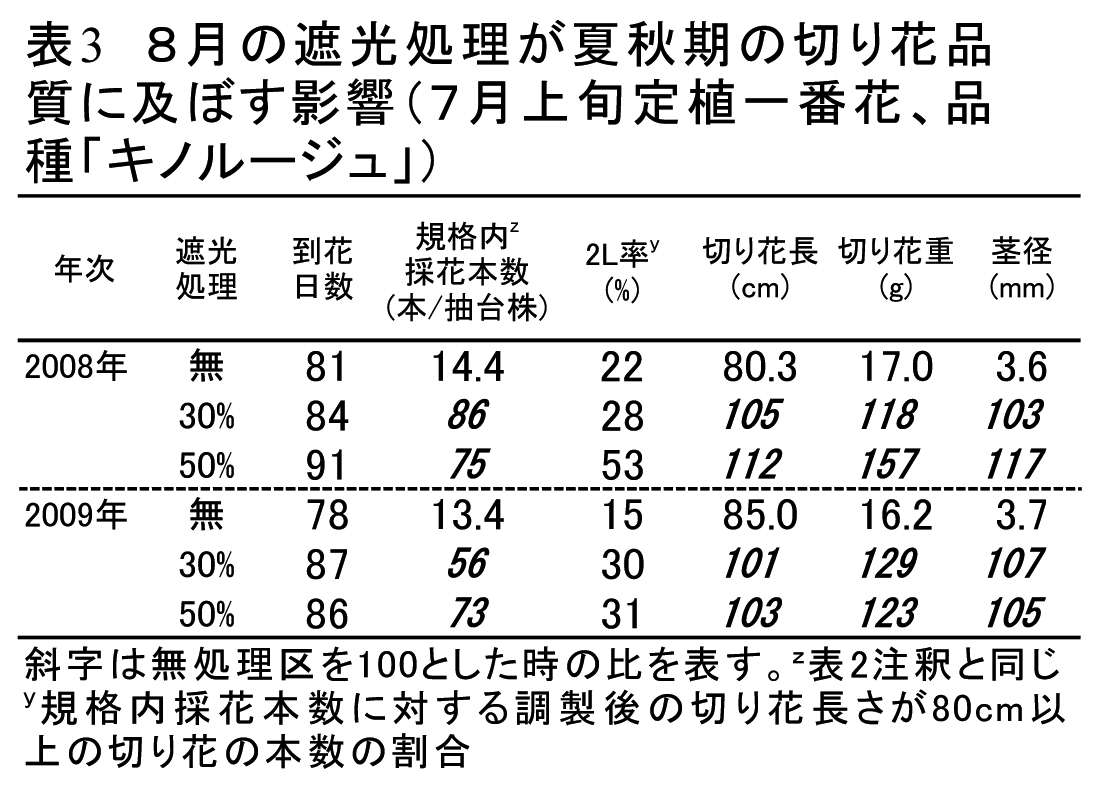 - 7月上旬定植で、抽台1〜2週間前である8月に遮光処理を行うことで、「キノルージュ」で9月中旬〜10月上旬に採花される一番花では、50%遮光区で切り花品質は向上するが、日照不足の年ではその効果が弱く、さらに通常年でも規格内採花本数は減少する(表3)。