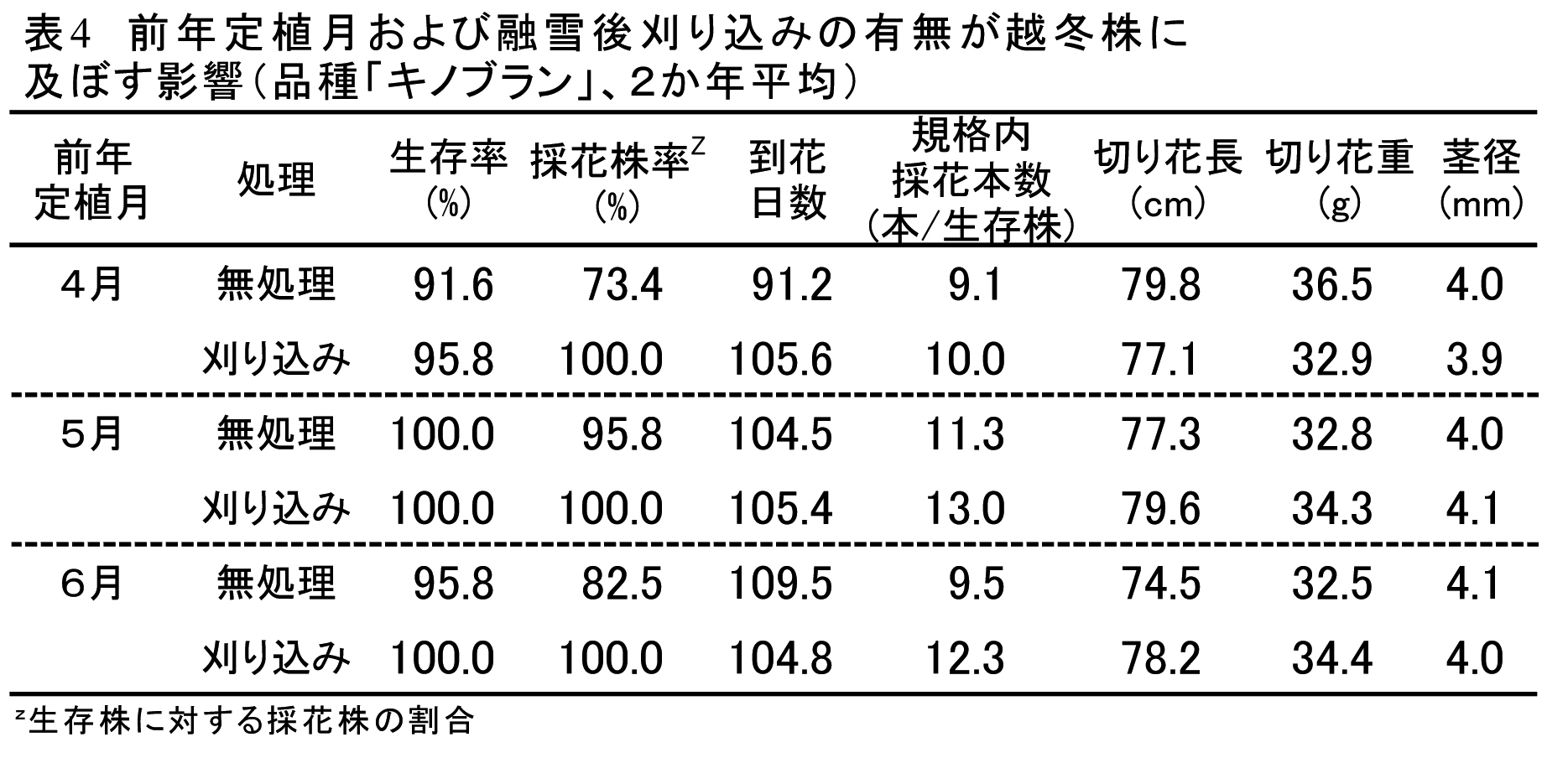 - 越冬作型の「キノブラン」において融雪後に株を地際で刈り込むことにより、前年4月定植の株では到花日数は長くなるものの、前年定植4、5、6月の全てで採花株率が向上し、規格内採花本数も増加したことから、安定的な切り花生産が可能となる(表4)。