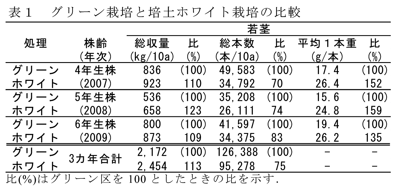 - 培土ホワイト栽培は、グリーン栽培より若茎総本数は少ないが平均1本重は重く、同等以上の総収量が得られる (表1)。