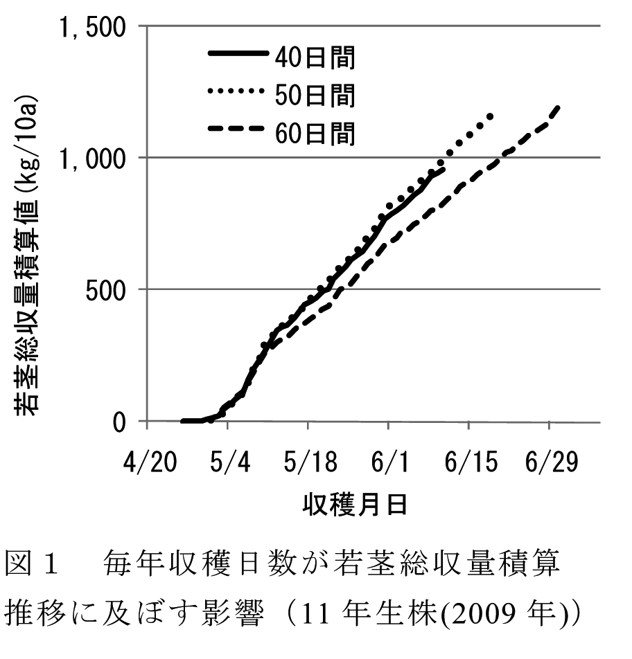 - 慣行無被覆培土ホワイト栽培の適正収穫日数検討では、50日間区が最多収で6カ年連続して多収を持続したため、50日間が適正収穫日数と判断される (表3)。40日間区と比較して、収穫始めからの40日間は総収量積算推移、日別平均1本重はほぼ同等であるが、プラス10日間の収穫により若茎総本数が多かったことが多収要因である(図1)。