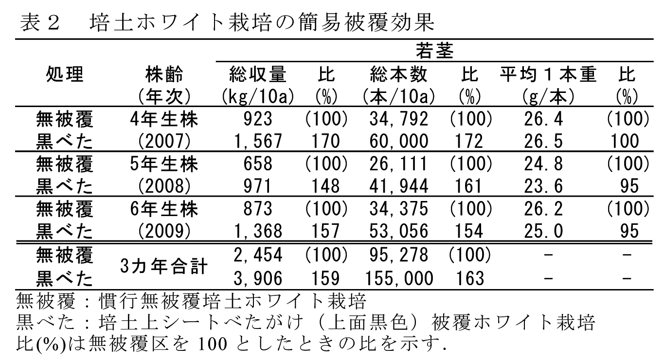 - 培土上シートべたがけ(上面黒色)被覆ホワイト栽培(40日間収穫のみ検討)は、地温を高め、総収量の対無被覆比が3カ年連続で148%以上であることから、連用可能と判断される (表2)。増収要因は、若茎総本数の増加であり、平均1本重はほぼ同等である。