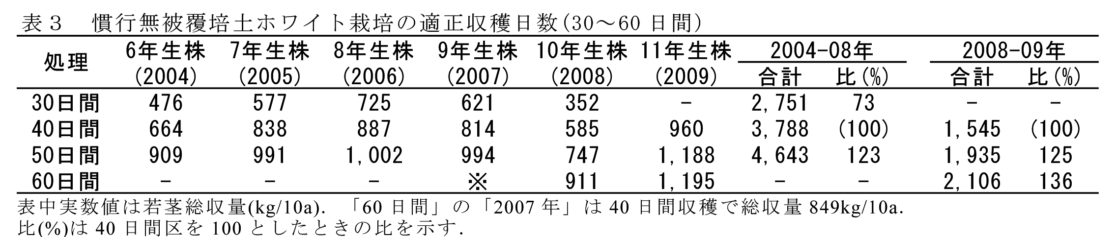 培土ホワイト栽培はグリーン栽培と同等以上の総収量が得られる。培土上シートべたがけ(上面黒色)被覆ホワイト栽培は地温を高め収量を増加させ、その効果は複数年持続する。慣行無被覆培土ホワイト栽培で安定多収持続可能な収穫日数は50日間である。