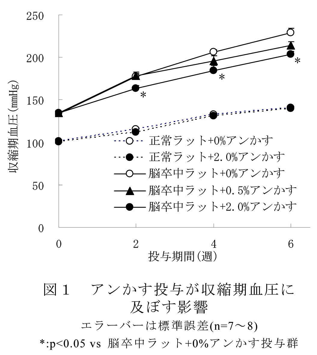 - 脳卒中易発性高血圧ラット(脳卒中ラット)に製アン副産物(アンかす)を投与することにより収縮期血圧の上昇が抑制される (図1)。