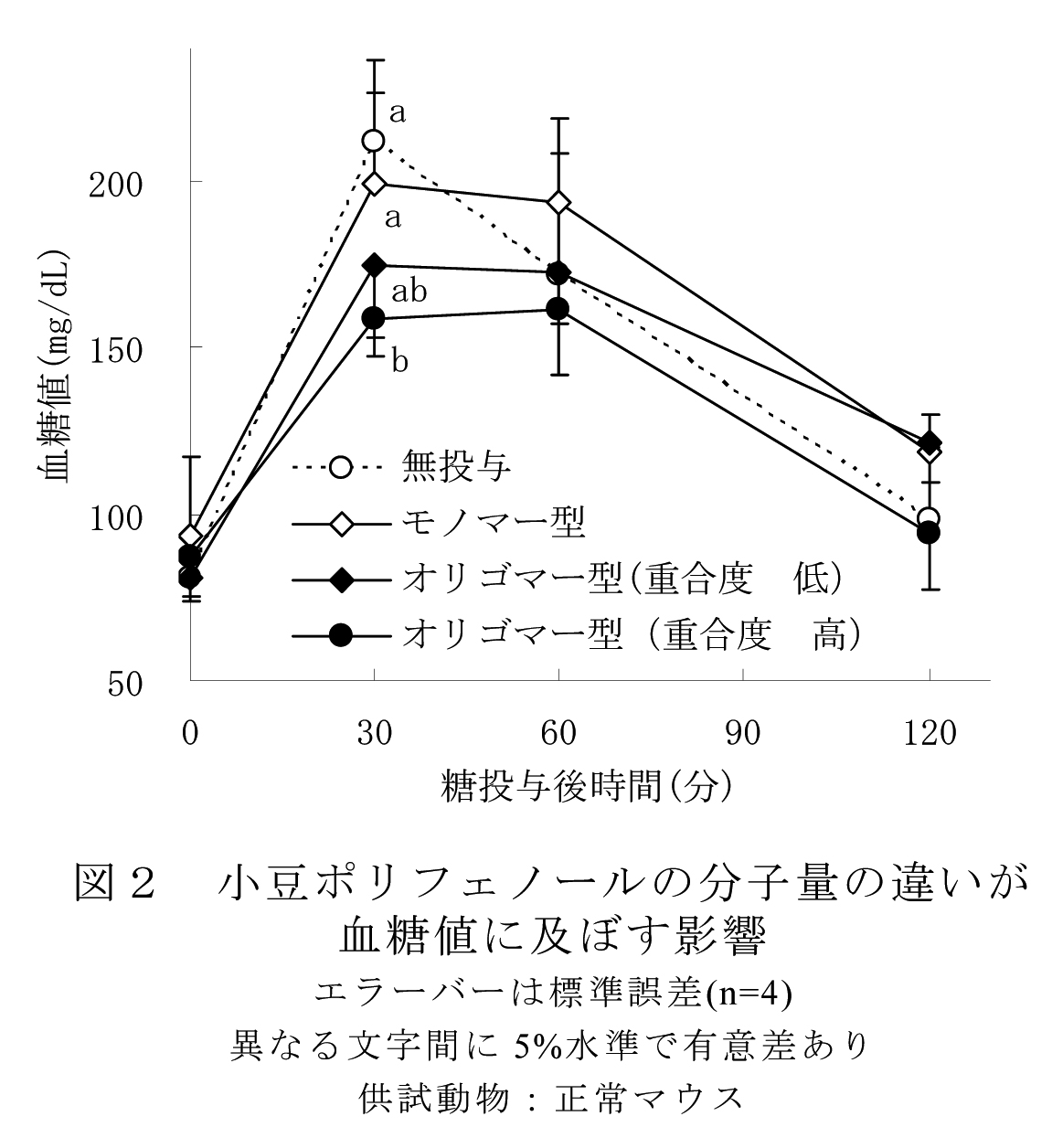 - 小豆ポリフェノールの投与により、血糖値の上昇が抑制され、その効果は、小豆ポリフェノールの中でもオリゴマー型ポリフェノールによるものであり、特に重合度の高いポリフェノールの作用が大きい(図2)。