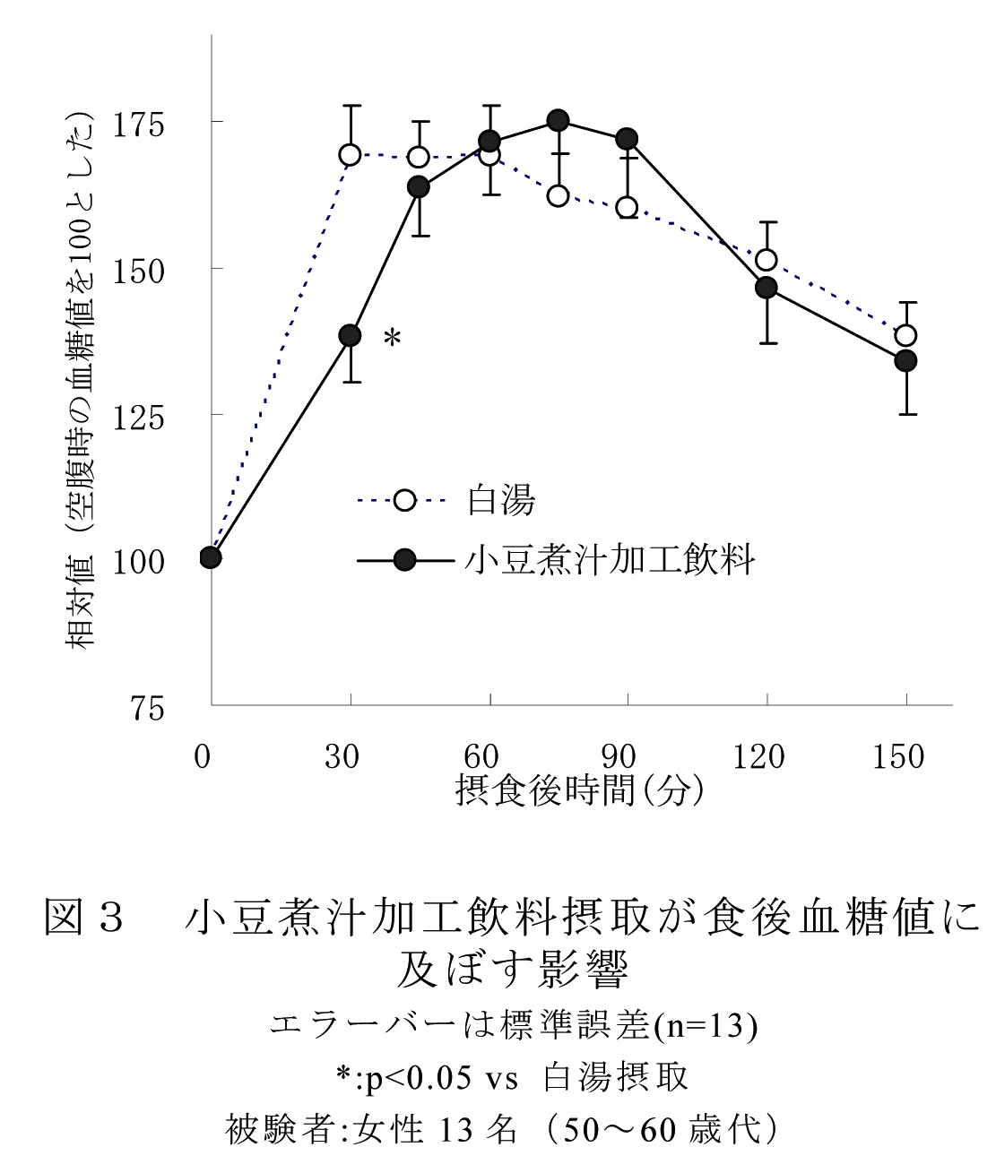 - 50〜60歳代の女性を対象にした試験では、小豆煮汁加工飲料50mL(333.5mgポリフェノール相当)を食事前に摂取することにより、食後30分以内の急激な血糖値上昇を抑制する (図3) 。