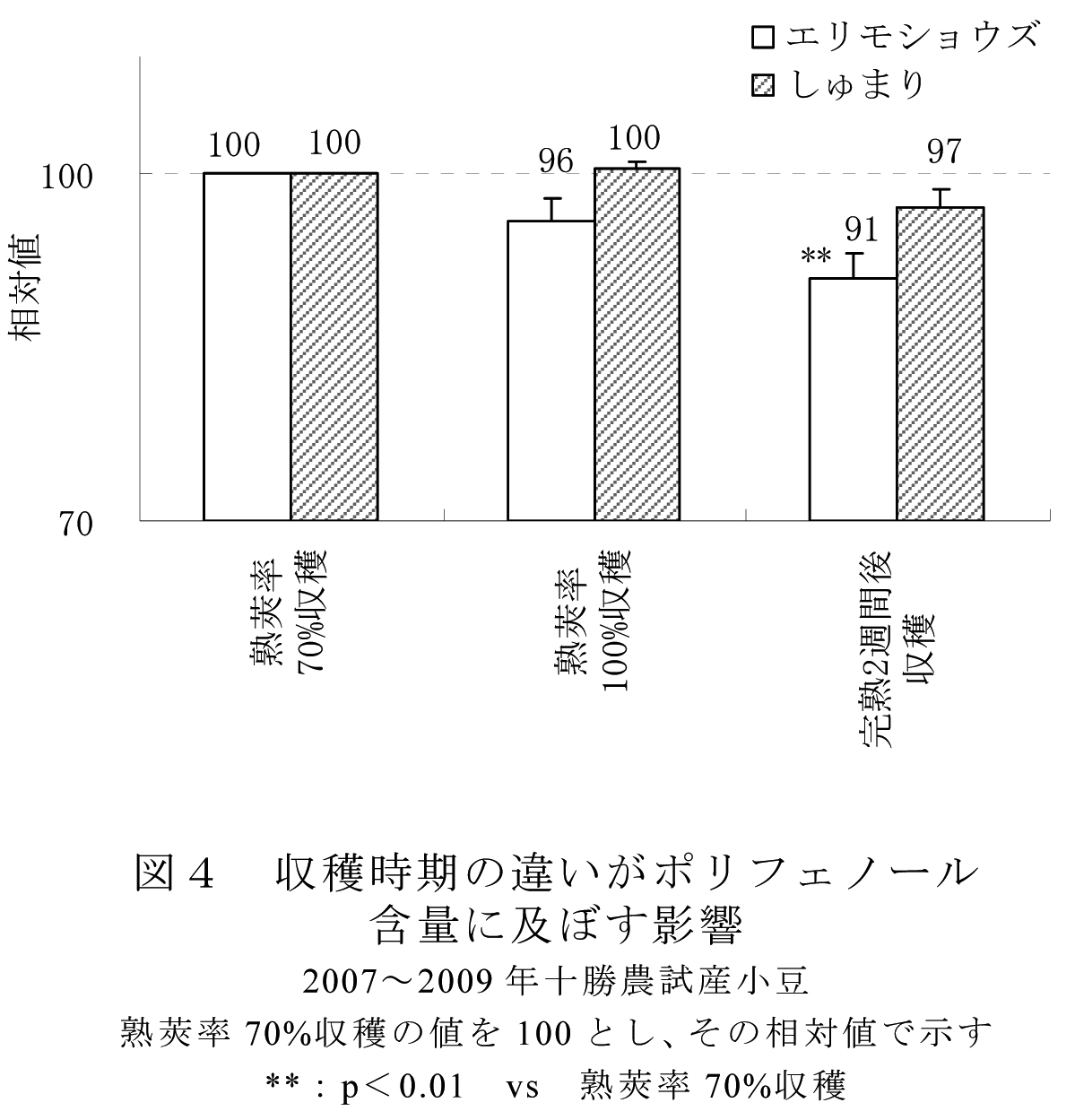 - 収穫時期が遅れるほど小豆のポリフェノール含量は低下する (図4) 。