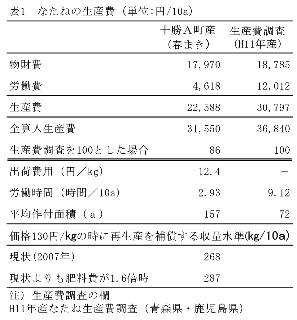 - 北海道の畑作地帯におけるなたね栽培は、機械作業が大半を占めるため労働費が府県産を大きく下回っており、全算入生産費は府県産の86%の水準である(表1)。また、販売価格が130円/kgの際に再生産を補償する収量は、268〜287kg/10aである。