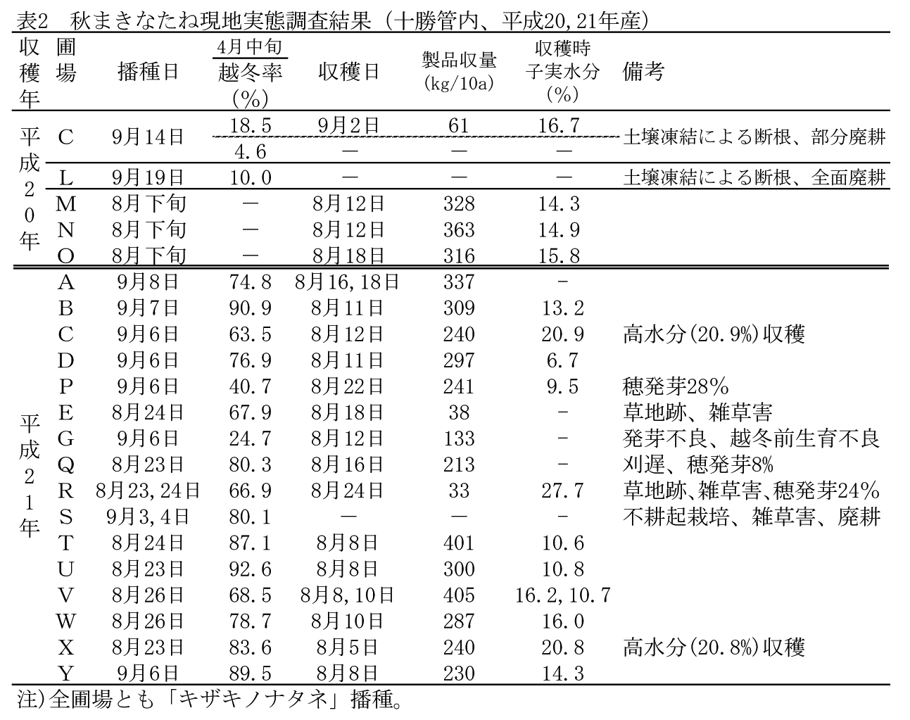 - 秋まき栽培の現地圃場では、「キザキノナタネ」を8月下旬〜9月上旬に播種し、適期収穫することにより、280kg/10a以上の収量を得る事例が認められた。しかし、9月中旬播種で土壌凍結による断根や雪腐病の発生による越冬率が低下したため廃耕となった事例や、草地跡の栽培で雑草害の影響で低収となった事例があった(表2)。