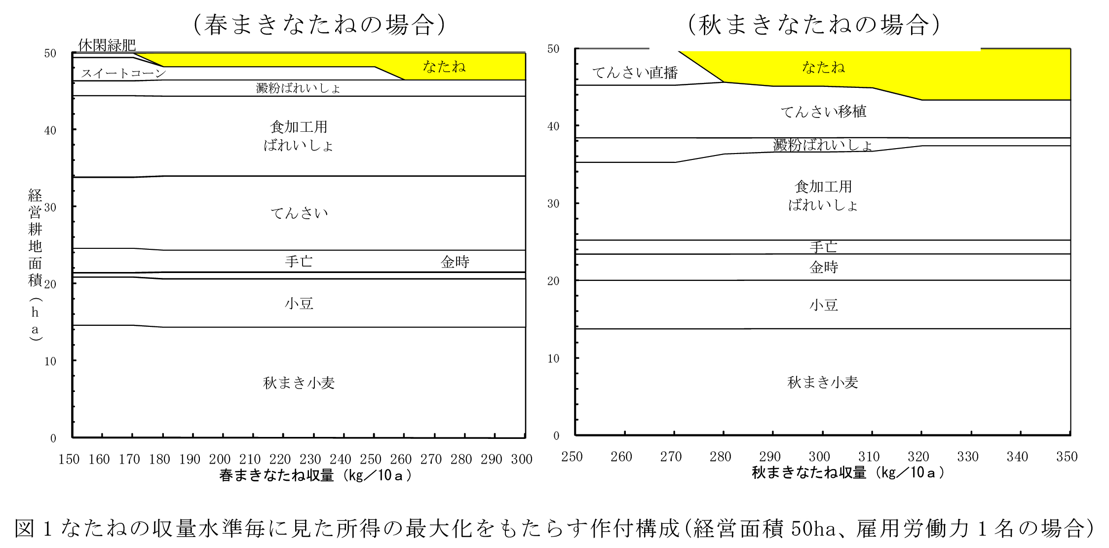 畑作地帯になたね栽培を導入できる収量下限値は春まき180kg/10a、秋まき280kg/10aであり、春まきでは「キラリボシ」、「ななしきぶ」を4月下旬までに播種、秋まきでは「キザキノナタネ」を8月下旬〜9月上旬に播種を行う。