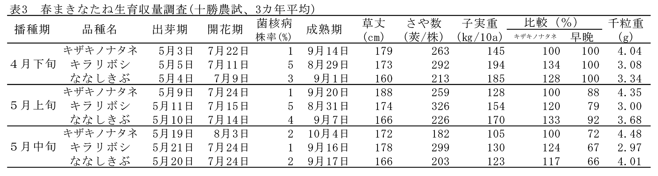 - 春まき栽培における2カ年の現地実態調査では、春まき適性の低い「キザキノナタネ」や菌核病に弱い導入品種の作付などにより150kg/10a以下の収量であった。
