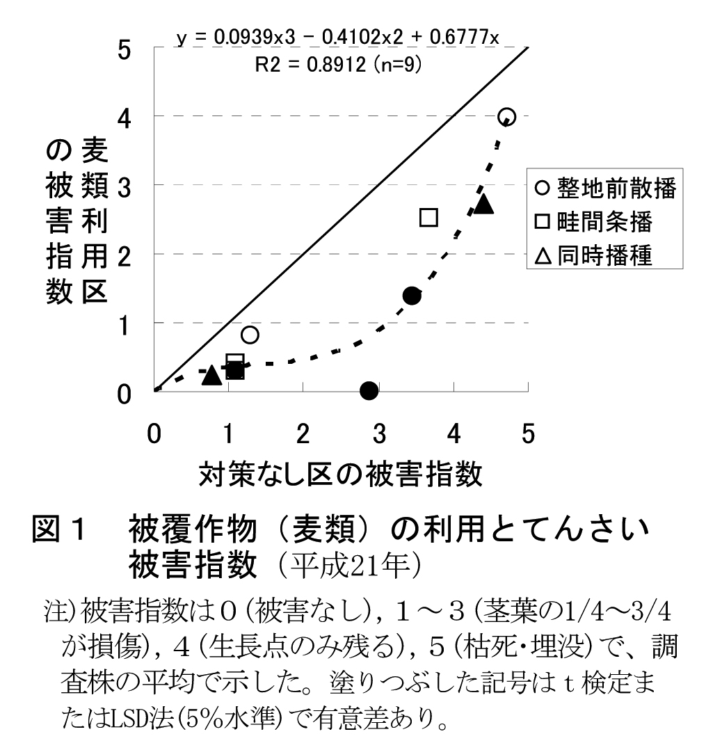 - 平成21年5月の強風による風害発生ほ場の調査では、被覆作物の利用(麦類の整地前散播方式、畦間条播方式、同時播種方式)は、対策なしより被害が小さい(図1)。