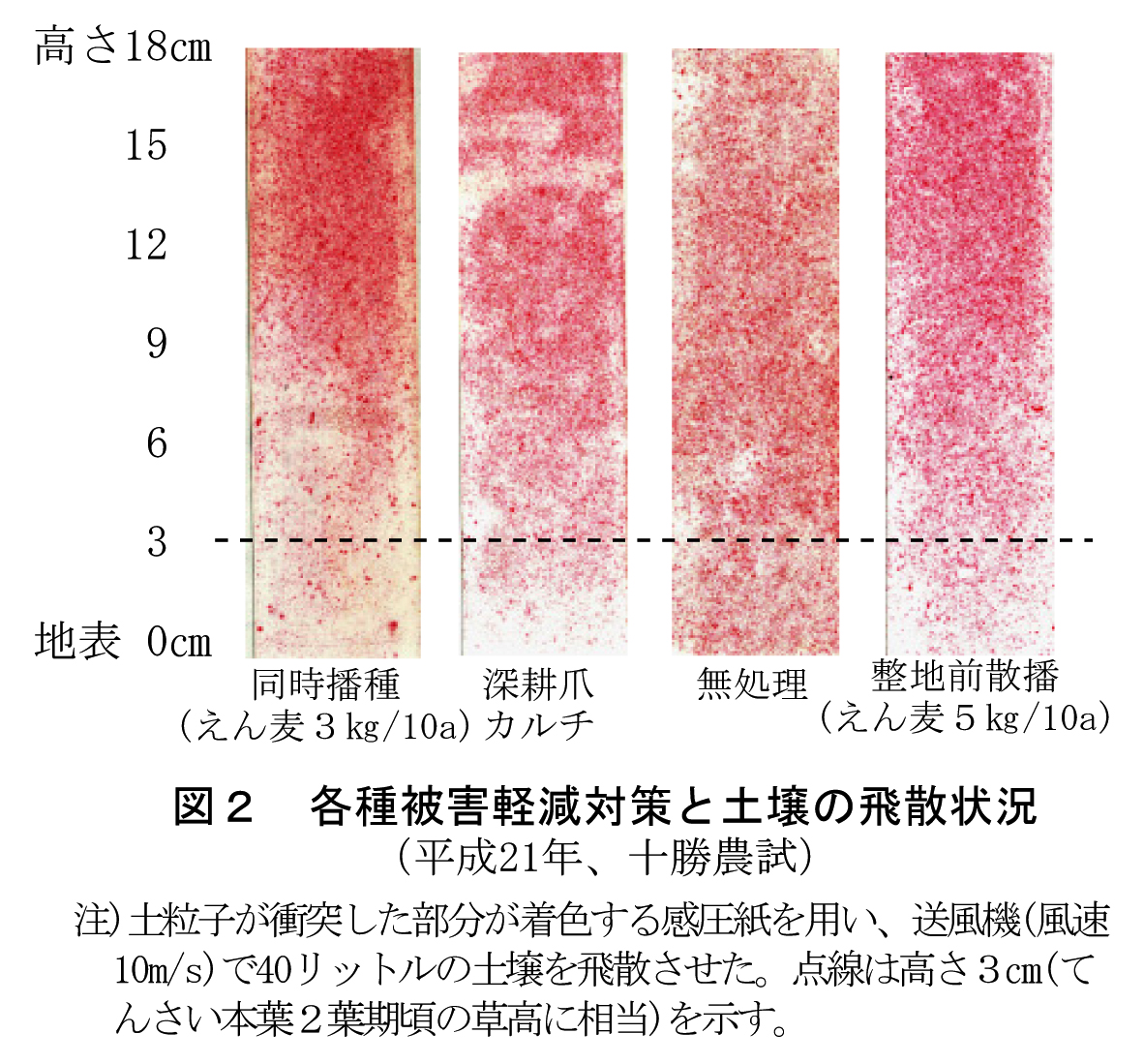 - 麦類播種ユニットを装着した播種機でてんさいの側方3〜6cmに麦類(えん麦・秋まき小麦、播種量3kg/10a)を条播する同時播種方式は、地表面の風速が無処理より弱く(表1)、地表面付近を飛散する土粒子は整地前散播方式よりやや少ないことから(図2)、飛来土壌による被害を軽減する効果が大きい。