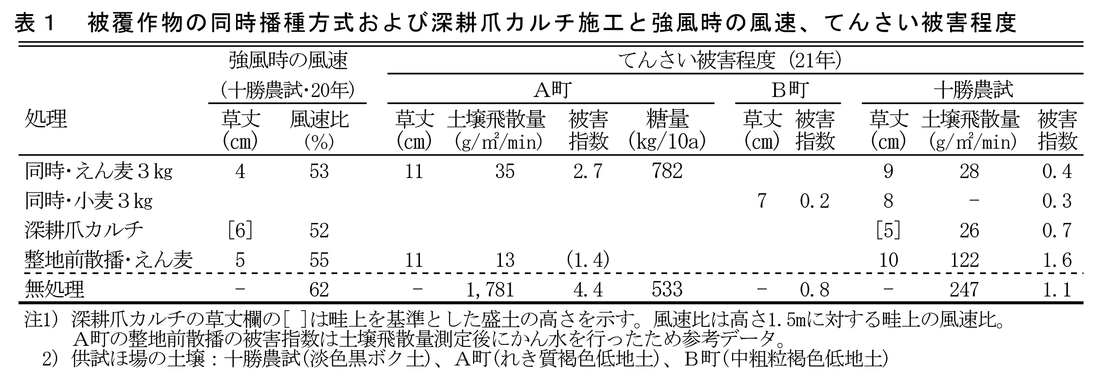 テンサイ、直播栽培、風害、被覆作物、深耕爪カルチ、砕土率、鎮圧