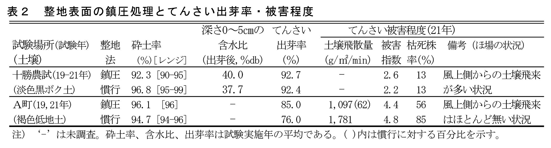 - 整地作業時における鎮圧強化は、A町では土壌飛散量が少なく被害軽減効果があるが、風上側からの飛来土壌が多い状況では効果はない。砕土率の目標を90〜95%とやや粗くして整地表面を強く鎮圧すると、慣行整地と同等の出芽率を確保できる(表2)。