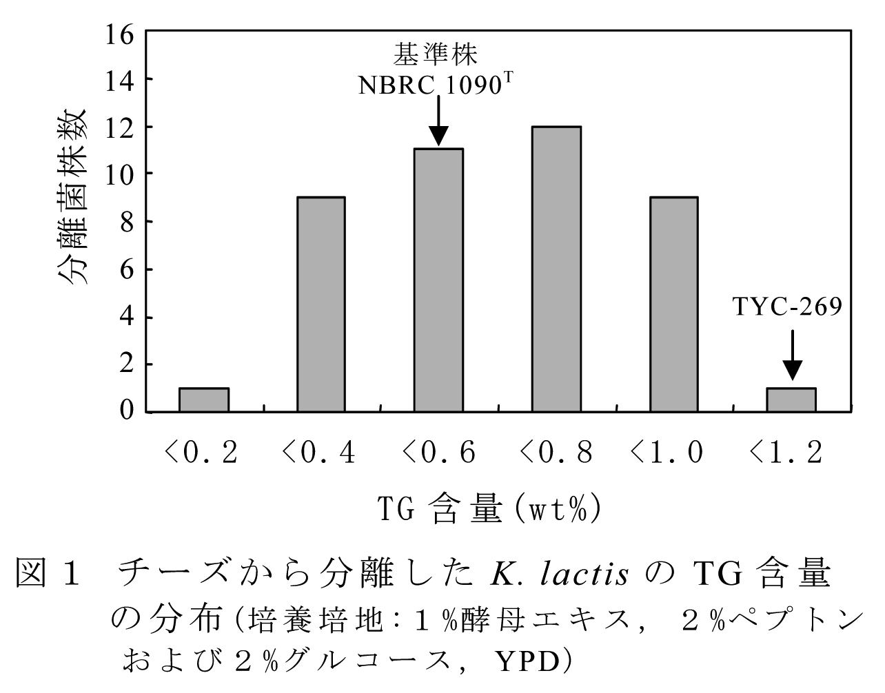 - K. lactisはチーズ中に多く検出され、それらの中にはTG含量に差異が見られる菌株が存在する (図1)。9点の検体から分離した43株のうち、TYC-269株が最もTGを蓄積する(乾燥菌体重量当り1.1 wt%)。